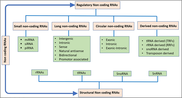 Several evidences prove that ncRNAs play essential roles in regulating the gene expressions by operating at genomic, transcriptional, post-transcriptional, translational levels ultimately influencing the biological processes such as growth, cellular differentiation, and stress adaptation[5]. Moreover, ncRNAs are now emerging as promising biomarkers in disease diagnosis and also been used as therapeutics of human diseases [6]. Typically, ncRNAs constitute a diverse family of RNA molecules that are transcribed by various RNA polymerases, and these ncRNAs can be broadly classified as structural/ housekeeping/ constitutive and regulatory class. Constitutive ncRNAs are expressed constantly at high levels in all cells, which mainly participate in basic cellular processes such as translation and RNA processing [7]. This class of ncRNAs comprises ribosomal RNA (rRNA), transfer RNA (tRNA), small nuclear RNA (snRNA), and small nucleolar RNA (snoRNA). Whereas the regulatory classes are usually expressed in a cell-type, stage-specific, or condition-dependent manner, functioning mainly to regulate gene expression [7] and are classified into small ncRNA (sncRNA), long ncRNA (lncRNA), circular RNAs (circRNA) and derived ncRNAs, the detailed classifications is presented in Figure 1.
