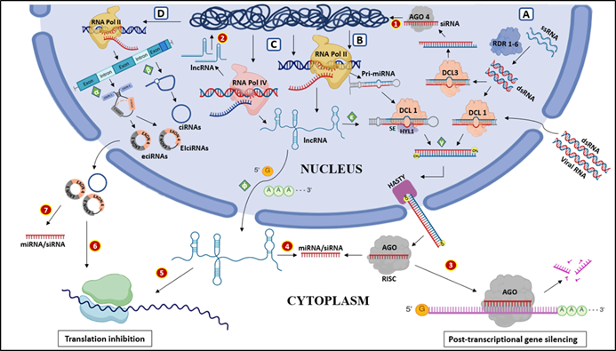 Generally, the ncRNAs follow well-defined pathways that begin with activation by specific signals, followed by their biogenesis and are subsequently subjected to various modifications or processing steps. The mature ncRNAs execute their precise regulatory role in transcriptional and post-transcriptional gene silencing, translational repression, RNA stability, chromatin remodelling [5]. Additionally, to maintain homeostasis and prevent nonspecific regulations, ncRNAs are degraded once they are no longer required by the cell through cellular RNA turnover pathways [8,9] Although cells may generate a wide range of ncRNAs, not all of them are functional; hence may have no regulatory roles [3]. Therefore, differentiating the functional ncRNAs from the total RNA pool and elucidating their regulatory roles in developmental, physiological, and stress-responsive processes is highly important. Such comprehensive studies on ncRNAs provide better opportunities to exploit the functional ncRNAs as valuable tools for crop improvement. The present review basically describes the diverse regulatory classes of ncRNA, with an emphasis on their biogenesis and the molecular mechanisms underlying their regulatory functions in plants.