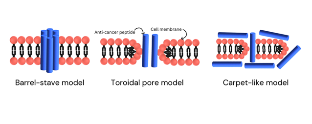 In contrast, the Toroidal Pore Model describes the anticancer peptides stick to the anionic regions i.e. the head part of the cell's membrane as they embed themselves into the membrane. As they keep entering, the membrane starts bending, forming a shape like a toroidal pore with a hole through it. This pore is made up of the membrane's head parts and the peptides inside it [31,32]. Because both positive and negative charges are present in this pore, it becomes stable. This process causes the cancer cell's membrane to lose its integrity, its charge, and leads to the leaking of the cell's contents, eventually lysis of cell [32, 33].