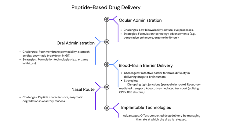 Oral drug administration is widely favoured for its convenience. But peptide drug molecules are generally not delivered orally. Due to poor membrane permeability, stomach acidity, and susceptibility to enzymatic breakdown in the gastrointestinal tract (GIT), but such challenges could be overcome by exploring various formulation technologies, including co-administering enzyme inhibitors with therapeutic peptides to enhance absorption and bioavailability [46]. Administration of drugs through the eyes proves beneficial for treating ocular malignant tumours, albeit facing challenges related to natural eye processes. The bioavailability of peptides could lead to potential cost issues. Ongoing advancements in formulation technology are made for optimizing the efficacy by incorporating penetration enhancers and enzyme inhibitors [47].