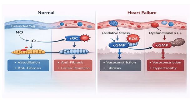 Accumulating evidence suggests that this residual risk cannot be fully explained by neurohormonal activation alone. Instead, chronic endothelial dysfunction, oxidative stress, and impaired myocardial relaxation play central roles in disease progression. Oxidative stress reduces nitric oxide (NO) bioavailability and oxidises the haem moiety of soluble guanylate cyclase (sGC), leading to diminished conversion of guanosine triphosphate to cyclic guanosine monophosphate (cGMP). Deficiency of cGMP signalling contributes to impaired myocardial relaxation, increased ventricular stiffness, progressive fibrosis, and adverse vascular remodelling [4,5].