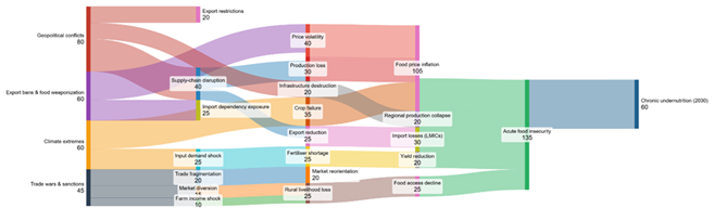 to food, especially in areas that rely on imports. The final flow into chronic undernutrition (2030) shows how long-term geopolitical